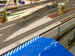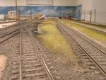 Az alapréteg Heki bokrokkal és különböző szóróanyagokkal lett díszítve. A vasúti terület szélét jelentő alapra óriásplakátokat és Faller 180413 kerítést ragasztottam. A vágányok közötti trafóház szintén Faller termék.