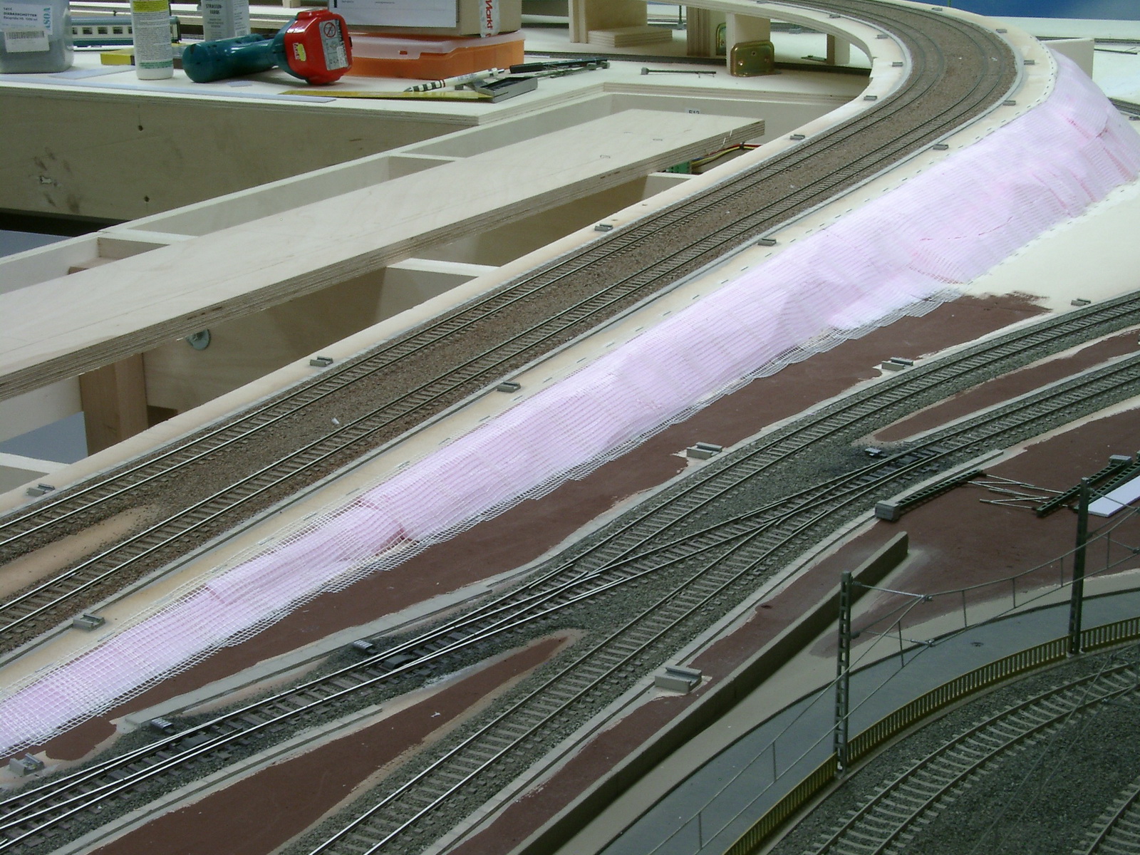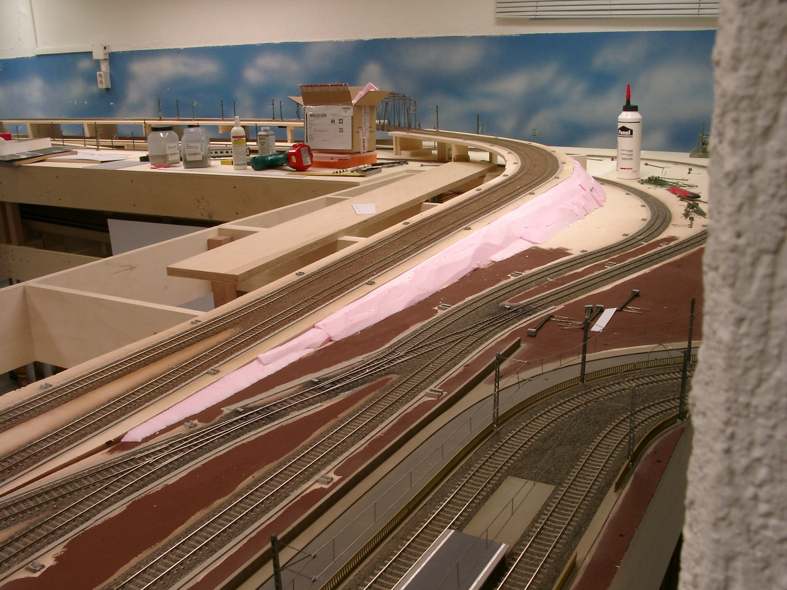 A sok városi kő, beton és aszfalt után - gondoltam - eljött az ideje kimenni egy kicsit a természetbe, a változatosság gyönyörködtet, de legalábbis kevésbé egyhangú így a munka. A pályaudvarról kifutó vágányok közötti szintkülönbséget egy szép kis töltésoldallal gondoltam összekötni. Ennek alapját 8 cm-es XPS lapból faragtam ki. Ez egy remekül használható, könnyű anyag, barkácsáruházakban táblákban beszerezhető különböző vastagságokban, vágható szikével, vasfűrészlappal, reszelhető, formázható. Ennek ellenére masszív, erős alapot lehet készíteni belőle.