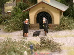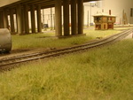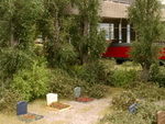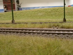 Az épület és a rámpa között kevés hely maradt, ide Noch támfalat tettem, a töltésoldalt és a réseket gipszeléssel tűntettem el. A már korábban bemutatott módszerrel elkészítettem a füvezést, itt annyival gazdagítottam a növényzetet, hogy még az első réteg fű leszórása előtt a ragasztós rétegbe beleterítettem kis foltokban Silhouette 976-26H hálót, ennek köszönhetők a képeken látható, kiemelkedő csomók.