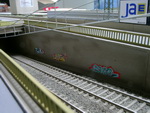 A száradások közötti időben többek között elkészítettem a kétvágányos fővonal alatt, ívben haladó vágány körüli tereptárgy elkészítését. Ide egy vasbeton portálos, árkádos átjárót képzeltem el. Ennek a vázát rétegelt lemezből vágtam ki és ragasztottam össze. Mestertapasszal tömítettem a réseket és a rétegelt lemez csíkos felületét. Heki betonszínű festékkel alapoztam, szürke, barna, okker és fehér foltokkal fedtem majd vizes szivaccsal visszamostam a felületet.