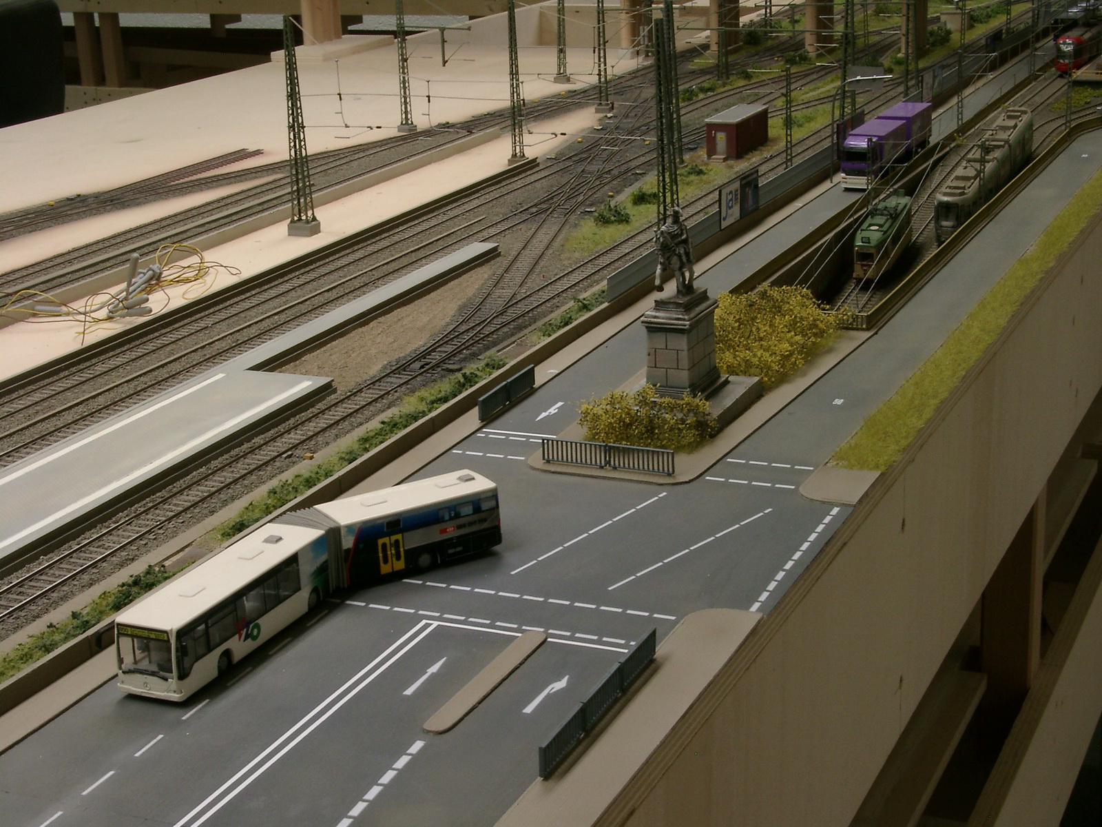 A régi városképet át kellett alakítanom, a hosszabb állomási vágányok és azok középre helyezése, ha alapterületben nem is jelentenek nagymértékű csökkenést, a tagolás teljesen átalakult. Ebből kifolyólag a legtöbb épület új helyre kerül, az egyetlen, ami megmarad a régi helyén, az a bonni állomás épület. Az épület előtti villamos vonal viszont új helyen és új megvilágításban jelenik meg. Kölnben és Hannoverben is nagyon tetszett a villámos föld alá bújtatása, főleg a belvárosi részeken jellemző ez az ÜSTRA megoldás, bár Bonnban pont nem így van, de a téma megfogott. Az állomástól jobbra eső sávban, ahol a régi asztalon számos épület volt (Burger King étterem, Merecedes szalon és szerviz, kamionterminál, társasház), most csak egy 4 sávos utat és a kéreg alá bebújó villamos vonalat álmodtam meg.