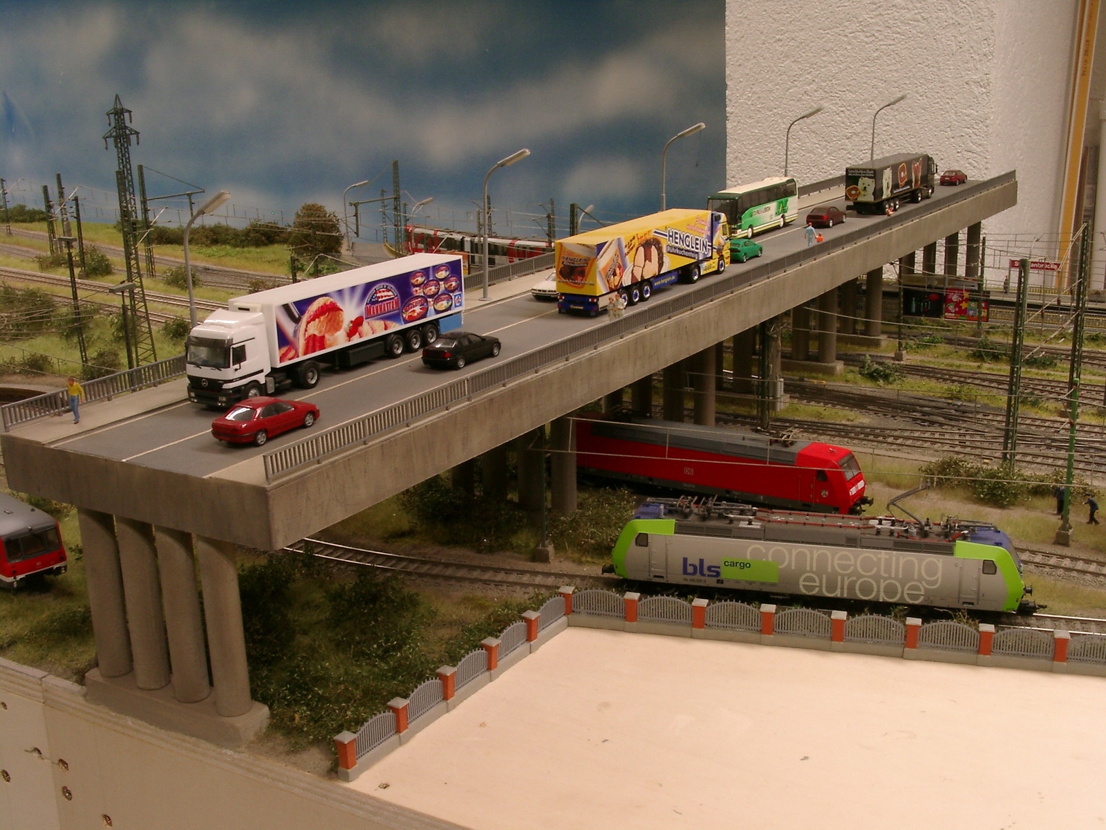 A felüljáró oldala és a járda 1,5 mm-es sztirol lapból készült, a korlát átfestett Faller. Az alapozást betonszínű Faller festékkel készítettem, erre került először légecsettel fújva higított Revell 87, majd száradás után középszürke akrilfestékkel csíkoztam be az oldalfalat, majd közvetlen ezután nedves szivaccsal visszamostam. A régi rízsszem izzós Viessmann kandelábereket átalakítottam ledesre, a vezetékeket a hídszerkezet alján vezettem végig és ezeket is festettem. A tápkábelek a rézcsőből hajlított csatornán keresztül lettek behúzva.