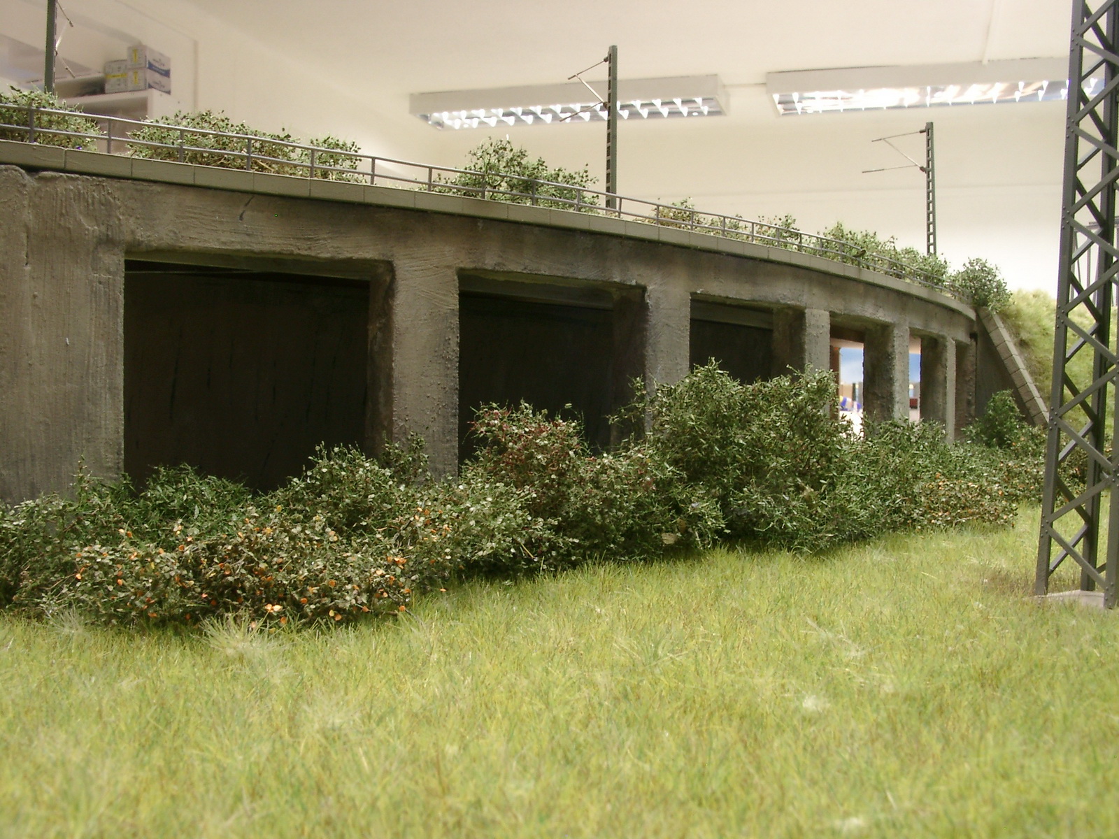 A villamos rámpa feletti födémre már régebben elhelyeztem egy szép Faller szobrot, az alapfüvezés is rég készen volt már. Most bokrosítottam, méghozzá bízva a mesterek ítéletében, én is Silhouette anyagból (200-15) dolgoztam. Nem olcsó, cserébe gyönyörű alapanyag, ebből nem nehéz szép bokros területeket készíteni.