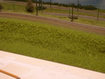 Ismét száradás, porszívózás, majd újabb csepegtetés, nem mérnöki pontossággal, de többségében az előző foltok közötti területre. Erre a rétegre már világosabb színt használtam, a VMC által gyártott 70112 számú, "Varjasi ősgyep"-nek keresztelt statikus füvét szórtam. A vágányok melletti részt még világosabb színnel, VMC 70211 "Parádi legelő"-vel szórtam, ezen a sávon viszont nem csepegtettem, hanem ecsettel terítettem a ragasztót.