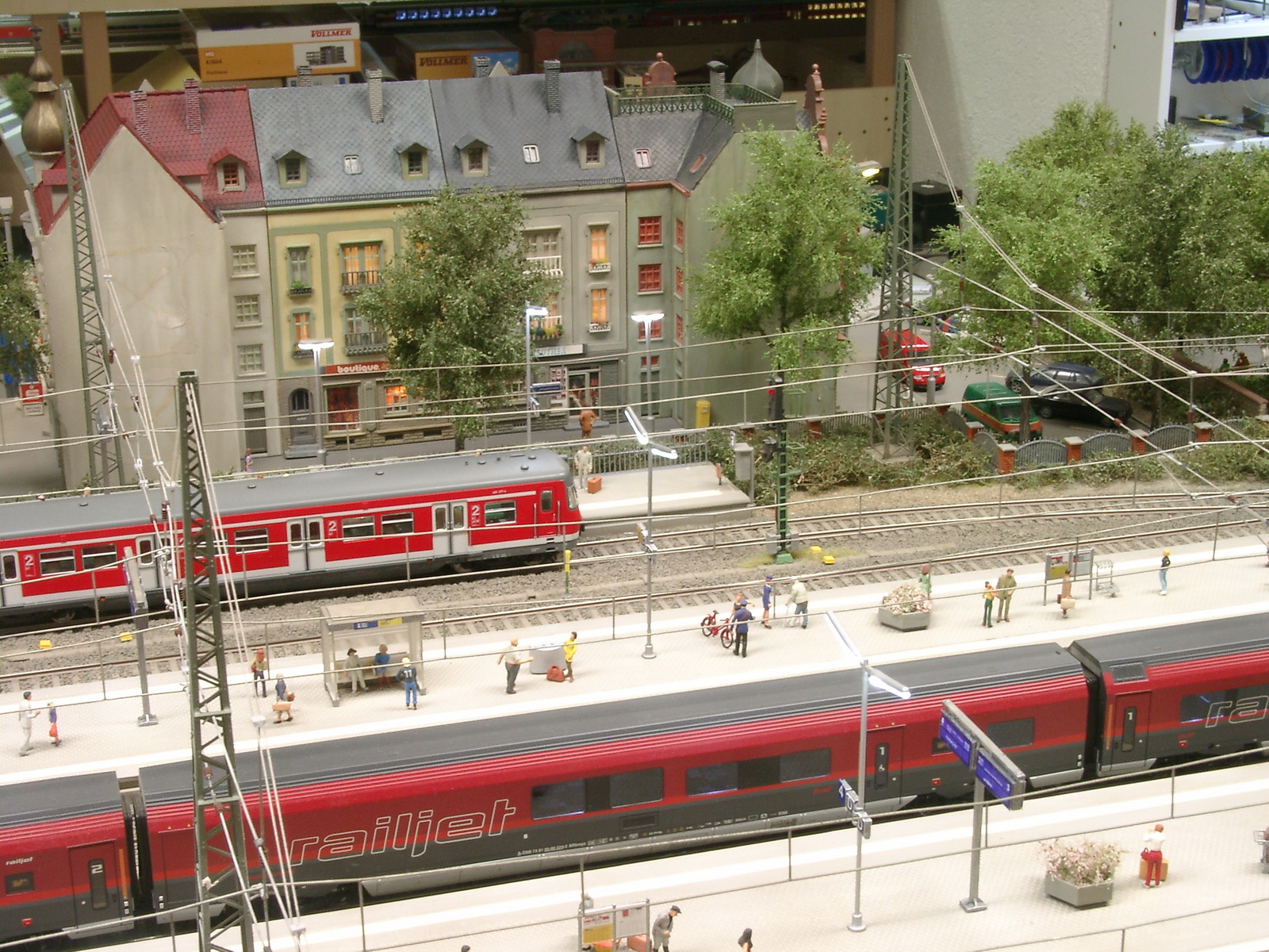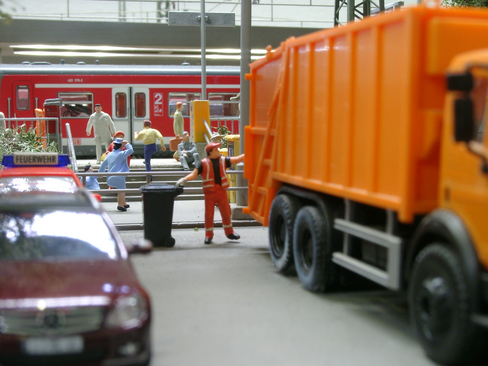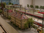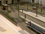 A terepasztal állomás felöli oldalán nem maradt más hátra, csak az állomás épületének elhelyezése és a körülötte lévő tér megépítése. A régi asztalon az állomással szemben állt egy villamos végállomás és azok az épületek, amik itt az új asztalon már el lettek helyezve a sínek mellett. A villamos téma is máshol jelenik már meg (itt képzeletben már a tér alatt halad), beindult hát a fantáziám, hogy mivel töltsem meg a rendelkezésre álló helyet. Az állomás melletti környezet nagyjából mindenhol ugyanazokból az elemekből áll: taxik, tömegközlekedés, parkolók, gyorséttermek és hömpölygő tömeg.