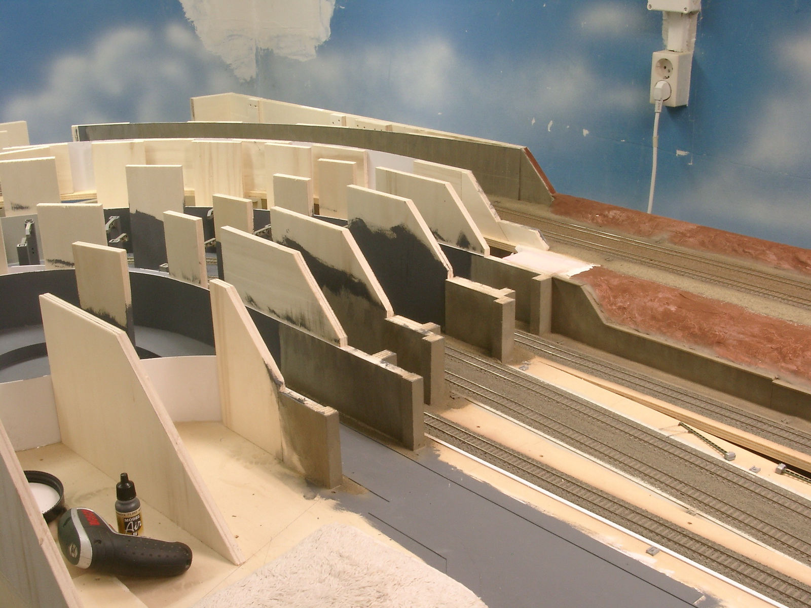 Kivágtam a két hátsó szint közötti rés bordázatát, valamint a hátsó alagútportált is. A már korábban bemutatott módon borítottam, gipszeltem, homokoztam és festettem.