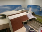 Száradás után Faller beton színnel alapoztam a felületeket, majd higított sötétszürke vízfestékkel átmostam, végül légecsettel homokbarna színnel ködöltem a felületet. A lámpaburák Brawa üveglapokból lettek vágva. A száradási időkben lehomokoztam a még üres felületeteket.