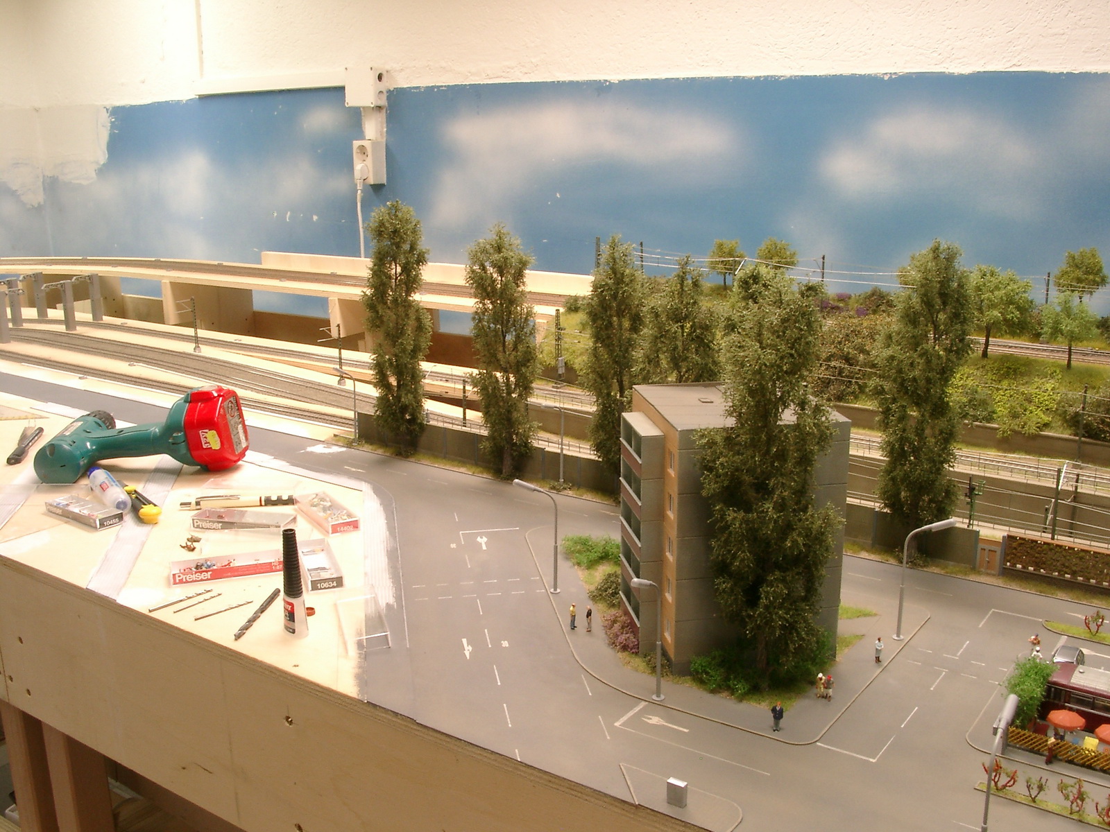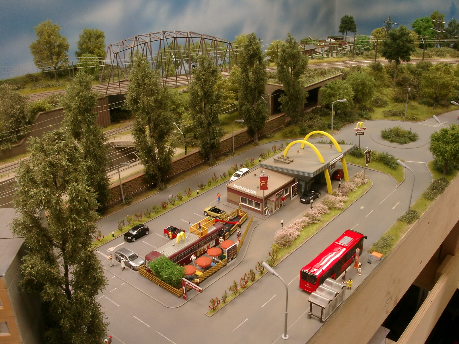 2017.07.27. Szeretek az általam épített asztalokon minél több témát megjeleníteni. Ha elég hely áll rendelkezésre, akkor igyekszem mindenből egy kicsit becsempészni a látvány kedvéért. Az U alakú asztalom jobb szekciója egy kis terület kivételével már elkészült, itt a fő hangsúlyt a nagy fejpályaudvar és az azt körülvevő óvárosi környezet uralja. Ahogy távolodok ettől, más témákat keresgettem. A vasút itt is a terület felét uralja, azonban itt nincsenek állomások, megállók, az U alak hátsó részén inkább csak átrobognak a szerelvények egymás mellett, alatt és felett. Az U alak bal oldalának nagy részét majd "csak" újra kell építeni, ide a Bettinaland vidámpark fog visszakerülni, előtte és mögötte természetesen sínek és vonatok, ugyanúgy, ahogy a régi asztalon volt. A most soron következő rész viszont új témák megjelenítését is lehetővé teszi. Sok lehetőséget, ötletet átgondoltam, nézegettem a fotóimat, végül úgy döntöttem, hogy ha már végül is itt a főpályaudvarról kivezető vasútvonalak cikáznak, körülöttük is teremtek egy kis külvárosi hangulatot, egy kis lakóteleppel, bevásárlóközponttal, McDonald's-al, autópályával.