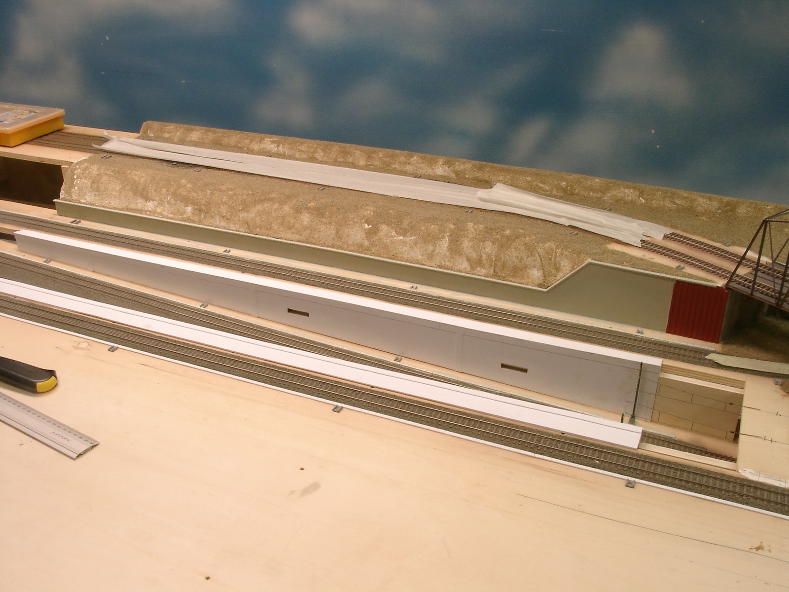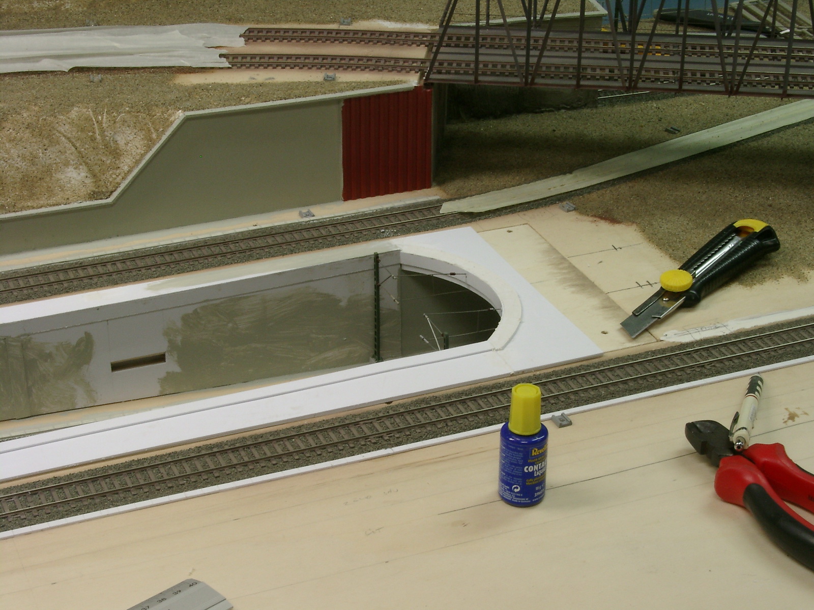 Sztirol lapból készítettem az alagútfalakat, ezeket karcoltam, festettem, koszoltam. Kiépítettem a felsővezetéket is, letisztítottam és ellenőriztem a síneket, majd ezután rögzítettem véglegesen a felső alaplemezeket.