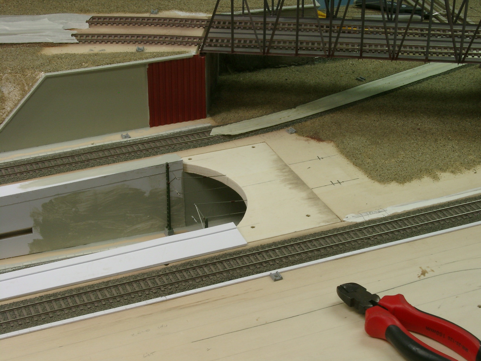 Az alagútportálok elkészítéséhez rétegelt lemezt, sztirol lapot és Auhagen 48577 fedőkövet használtam. A hézagok 2 cm és 5 cm vastag XPS lapokból alapját faragtam ki, erre kapcsoztam a gipszkarton szalagot. Gipszeltem, homokoztam, festettem, több rétegben füveztem a zöld területeket.