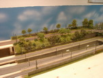 Az autópálya zajvédő fala a Kibri 38623-as készletéből lett kialakítva. Az útburkolati jelek: Heki 6560. A táblákat neten talált képekből szerkesztettem, a tartóoszlopokat sztirol profilokból ragasztottam és festettem.