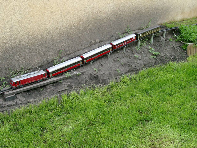 2000 tavaszán a Roco leállt a 0e méretű AlpinLine gyártásával. A beszorult készleteket 80-90%-os árengedménnyel kínálta a cég, mely kihagyhatatlannak bizonyult, azonban olcsó húsnak híg a leve, a hiányzó dolgokat vagy egyáltalán nem, vagy csak csillagászati áron, külföldről lehetett beszerezni. Ebből adódóan egy kb. 60 méter hosszú 1 vágányos pályát tudtam a két végén 1-1 hurokkal összehozni. Az építéshez 8 köbméter földet, 5 tábla 18-as rétegelt lemezt, kb 100 db facölöpöt, 60 méter léckerítést használtam el. Továbbá rengeteg növény, virág, füvezés, stb.. Jelenleg a kerti vasút építkezés az alábbiak szerint néz ki: